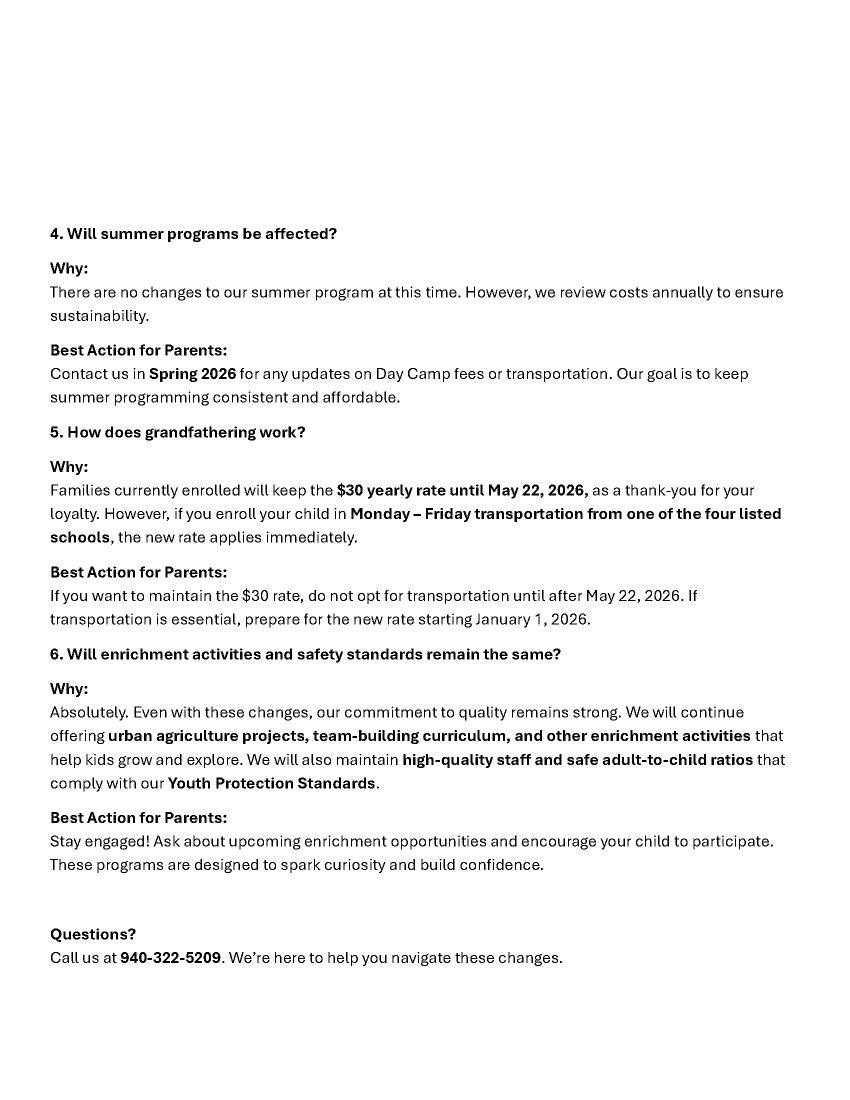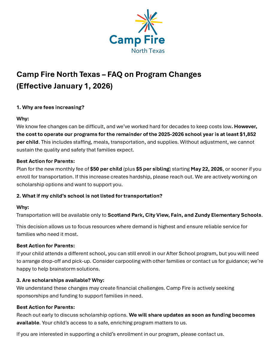 Parents you are responsible for dropping off and picking up your child from the program if Camp Fire does not pick up at your child's school.